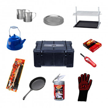 It includes, Pack LKS firelighters (12 blocks),Braai wipes dispenser, BBQ gloves (Hi heat), Medium Aluminium Tong, Basting Brush, Plastic Grid Brush, Refillable Gas Lighter, Veld Braai (Mild Steel flatpack), Stainless, Steel Coffee Mug, Enamel Tea Pot (2.5 lt.), Stainless, Steel Dinner Plate(257mm) and Skillet.